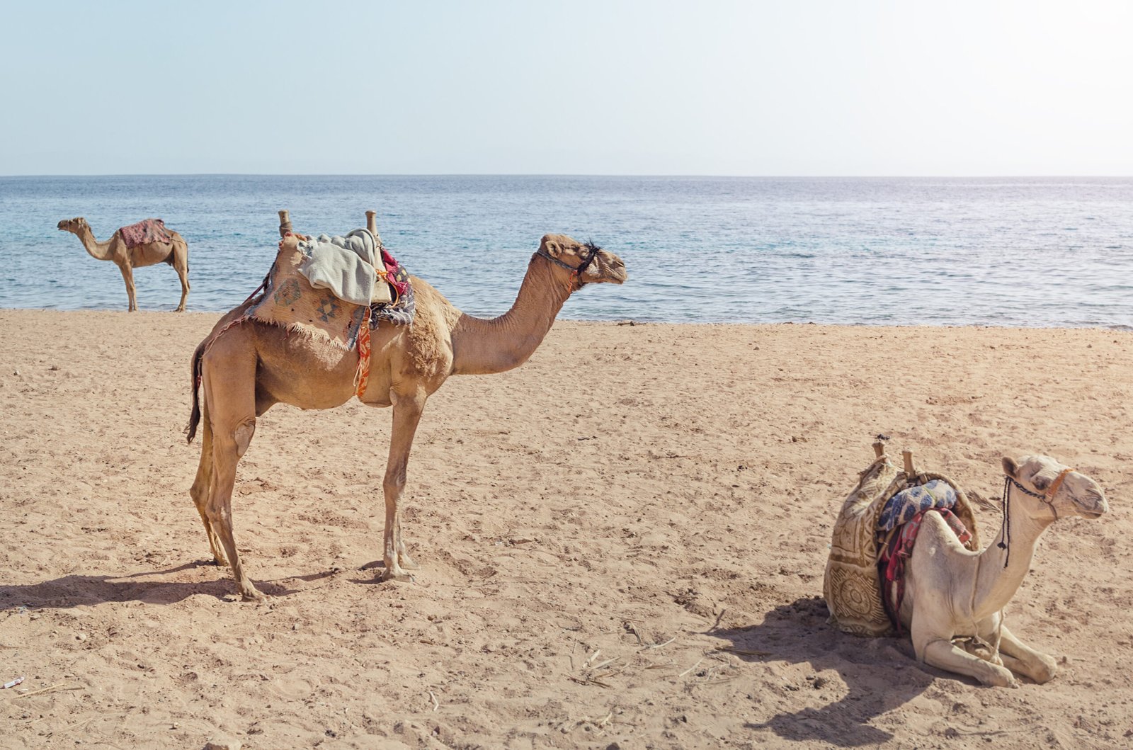 • Camel lies on the sand on the red sea, Egypt.